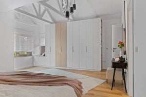 Este o altă necesitate în dormitorul unui cuplu tânăr. Este perfect dacă dressingul este suficient de voluminos încât să fie separat pe zone sau dacă există spațiu să se opteze pentru două dulapuri de haine. Dimineață toată lumea se grăbește și își caută lucrurile, de aceea e mai bine să se faciliteze crearea spatiilor personale.